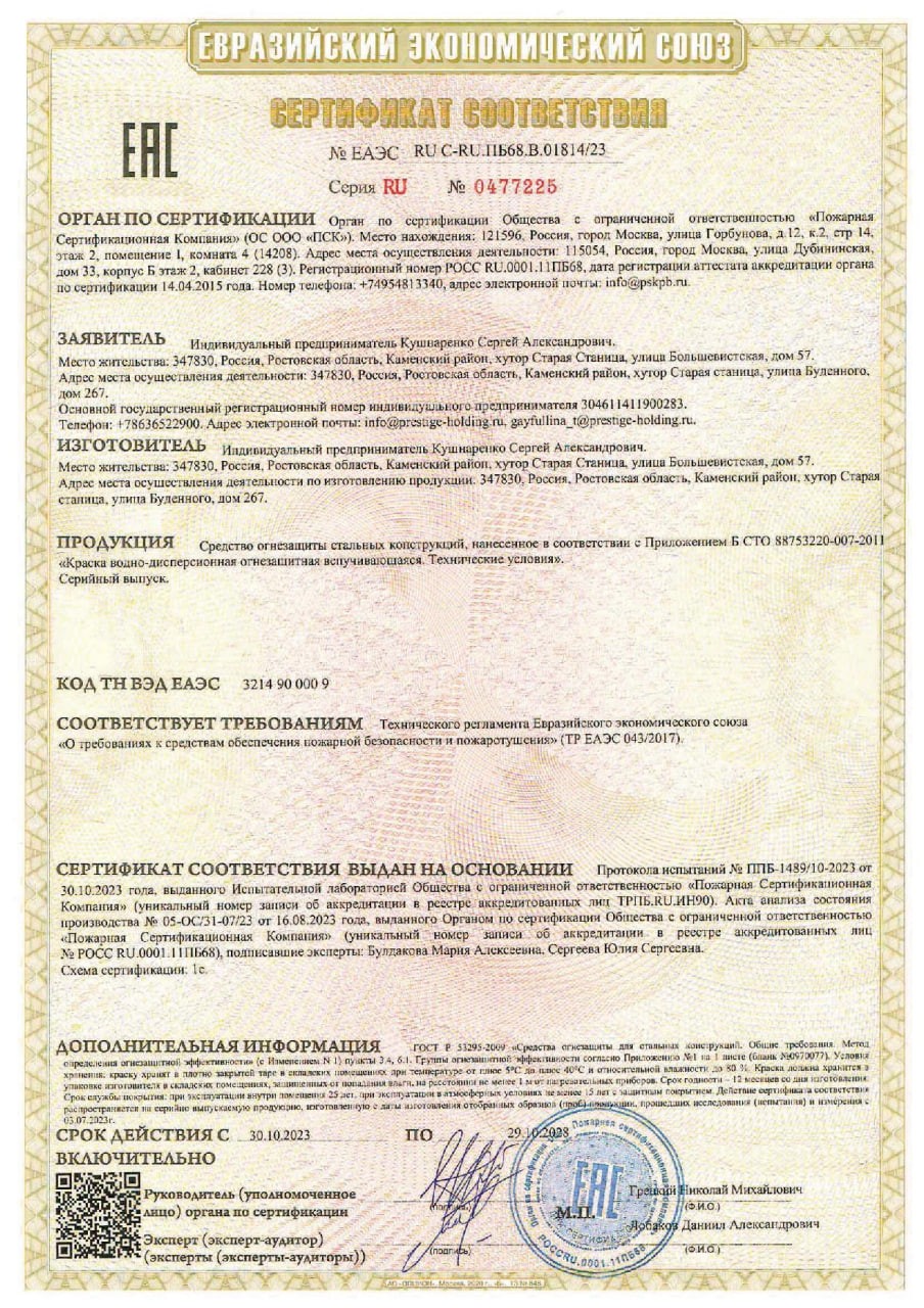 Описание товараЗащищает металлические несущие и ограждающие конструкции от огня. В зависимости от толщины слоя покрытие обеспечивает пределы огнестойкости - 45, 60, 90 минут по ГОСТ Р 53295-2009. ДоставкаООО "Компания Комплектол" предлагает: - Бесплатную доставку по графику (Владивосток, Русский,Трудовое, Уссурийск,Находка, Южно-Морской,Артёмовский городской округ, Городской округ Большой Камень, Фокино, Партизанский городской округ, Михайловка,Тереховка, Прохладное, Раздольное,Вольно-Надеждинское, Новый, Золотая Долина, Голубовка, Владимиро-Александровское, Екатериновка, Новолитовск, Волчанец, Штыково, Смоляниново, Романовка, Шкотово). Стоимость доставки на сумму покупки от 12000 руб. бесплатно, при покупке до 12000 руб. стоимость доставки 1500 руб. Срок доставки 7 дней. Срок доставки может изменяться и быть менее 7 дней.